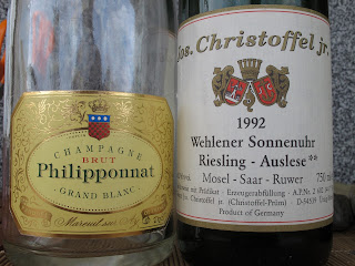 Wehlener Sonnenuhr, Riesling Auslese** 1992, Jos. Christoffel Jr. : je n'ai pas dégusté ce vin mais un rapide "coup de nez" laisse apparaître une sensation très aromatique, sur l'ananas confit et le miel. Il semblerait - d'après mes condisciples qui ont bu le vin - que la bouche était également sur un équilibre assez démonstratif et fruité ... Excellent